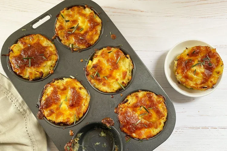 Preheat oven to 180C (160C fan forced). Grease a 12-hole 80ml (1/3 cup) muffin pan with oil. Prick the potatoes all over with a fork. Place in a microwave-safe bowl. Microwave on high until tender (about 7 minutes).
