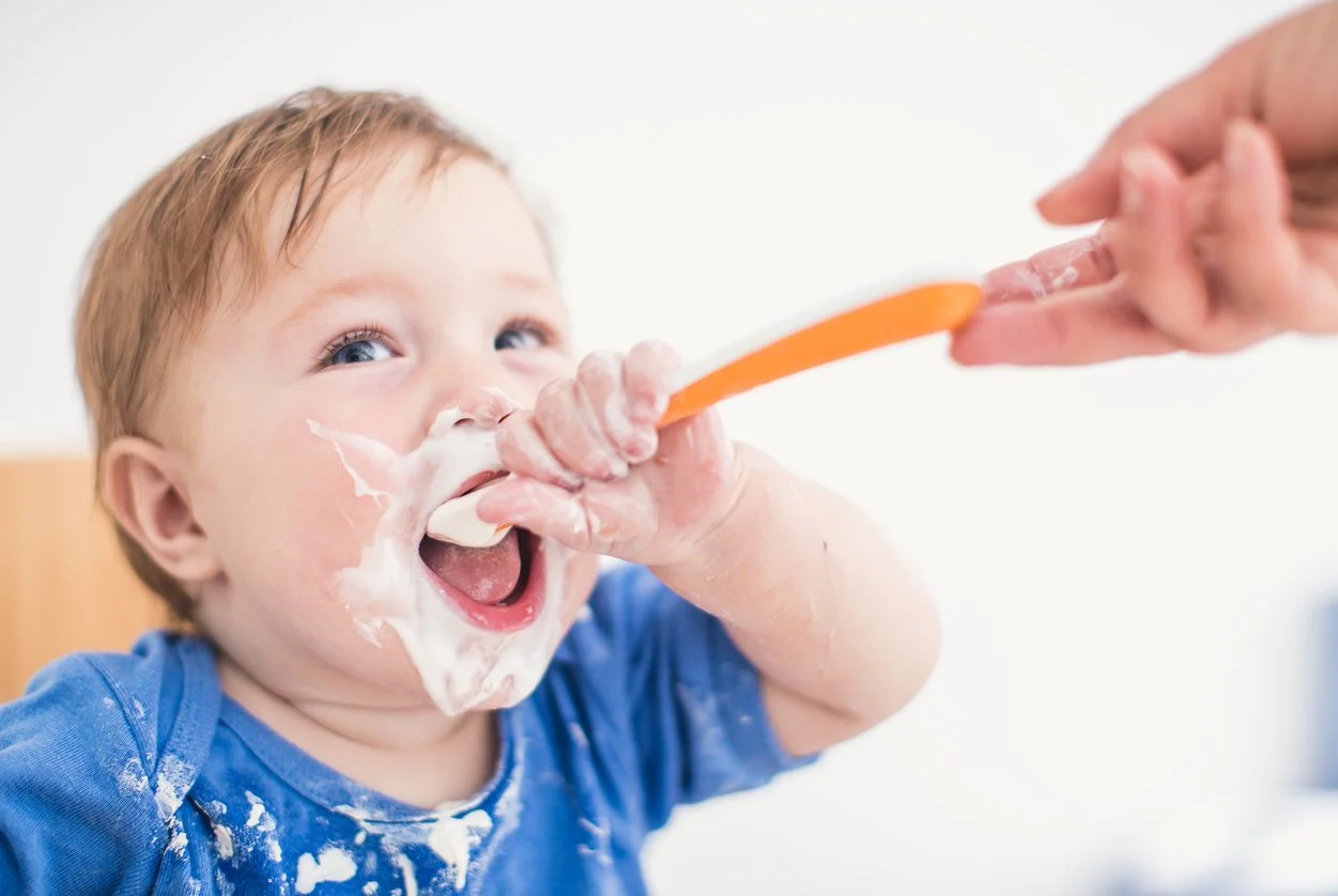 Encourage your toddler to feed themselves with support from you if they’ll allow it. Encourage feeding with utensils by preloading multiple spoons or stabbing food with multiple forks and allowing your child to bring them to their own mouth. There’s also no harm in them feeding themselves with their fingers.